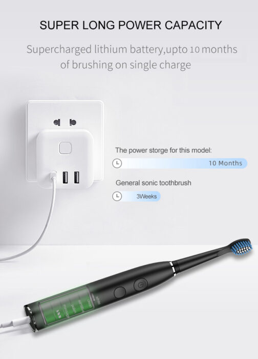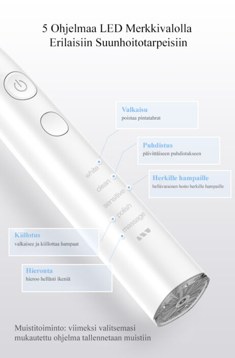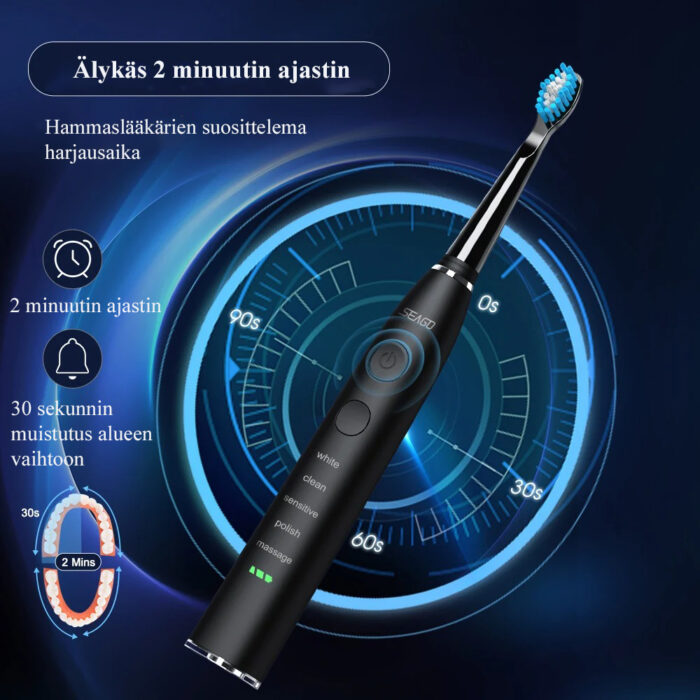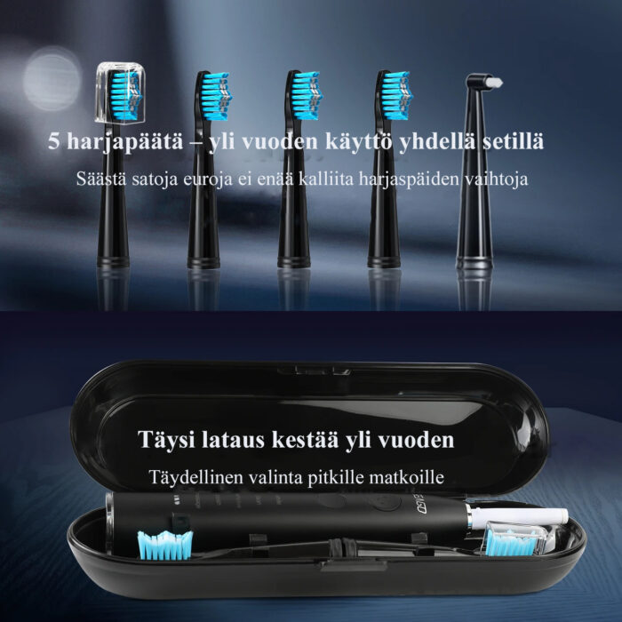 Tehokas syväpuhdistus 40000 VPM poistaa plakkia 10 kertaa tehokkaammin kuin tavallinen hammasharja. Vuoden akku & harjaspäät Täysi lataus kestää jopa vuoden täydellinen valinta matkalle ja kotiin. IPX7-vesitiivis rakenne Täysin vedenkestävä turvallinen käyttää myös suihkussa. Älykäs ajastin ja muistitoiminto 2 minuutin ajastin ja 30 sekunnin välein muistutus vaihtaa aluetta muistaa myös viimeksi käytetyn ohjelman. Pehmeät harjakset herkille ikenille Suunniteltu suojaamaan ikeniä pehmeät, pyöristetyt harjakset eivät vahingoita suun kudoksia. 5 harjausohjelmaa Valaistus, Puhdistus, Herkille ikenille, Kiillotus, Hieronta. USB-lataus & LED-merkkivalo Helppo lataus ja tilanäyttö yhdellä painikkeella. Moderni ja tyylikäs muotoilu Kevyt runko ja elegantti ulkonäkö, mustana ja valkoisena.