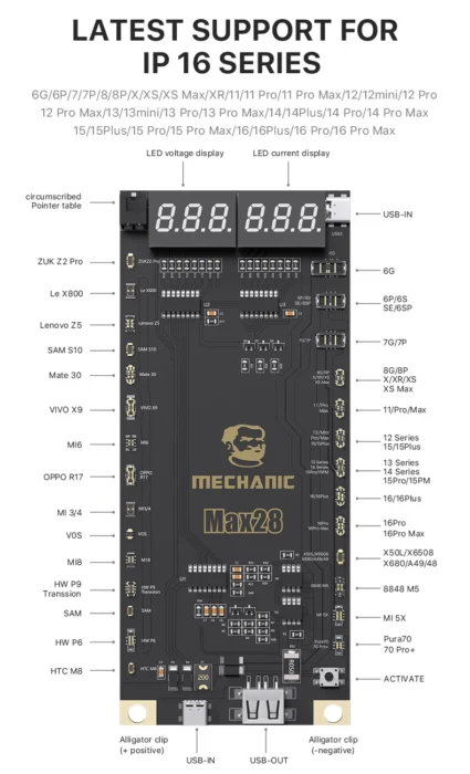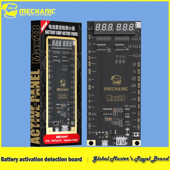 MECHANIC Max28 Akun Aktivointi- ja Testauslaite on välttämätön työkalu kaikille mobiililaitteiden huoltoammattilaisille. Tämä monipuolinen laite on suunniteltu nopeuttamaan ja tehostamaan akkujen testausprosesseja iPhone 6G:stä iPhone 16 Pro Max -malleihin sekä useimpiin Android-laitteisiin.