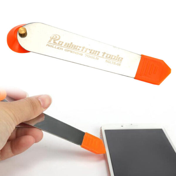Pyörivä rulla avaustyökalu tablettien ja puhelinten avaamiseen. Pyörivä muovinen rulla helpottaa laitteden avaamista. Liu’uta terää kosketuspaneelin ja rungon välistä varovasti irrottaaksesi sen. Lämpö helpottaa usein liimausten avaamista.