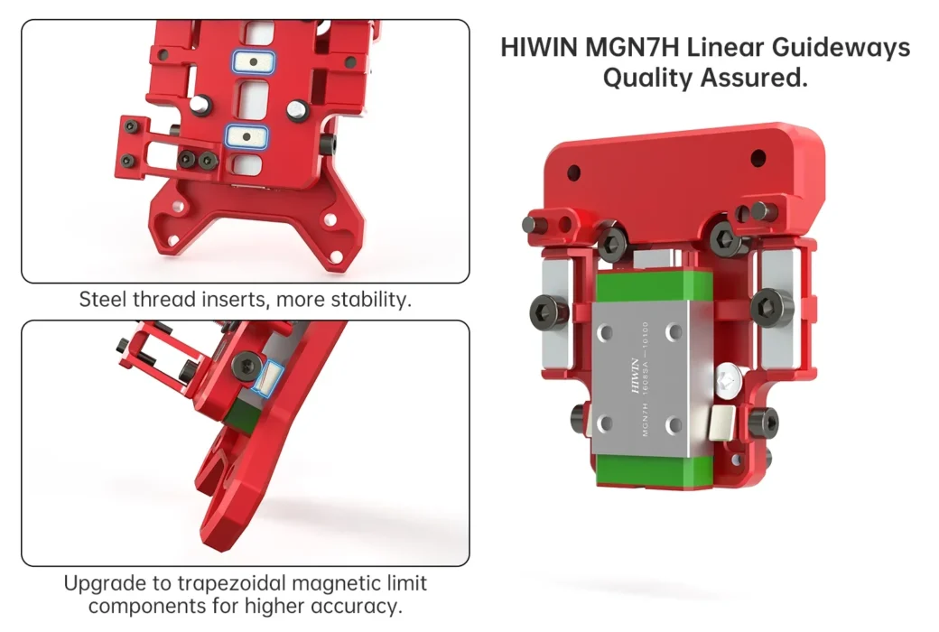 – Esikiristetyt lineaariset ohjainkiskot takaavat sujuvan ja tarkan liikkeen, vähentäen mekaanista kitkaa ja parantaen tulostusnopeutta.
