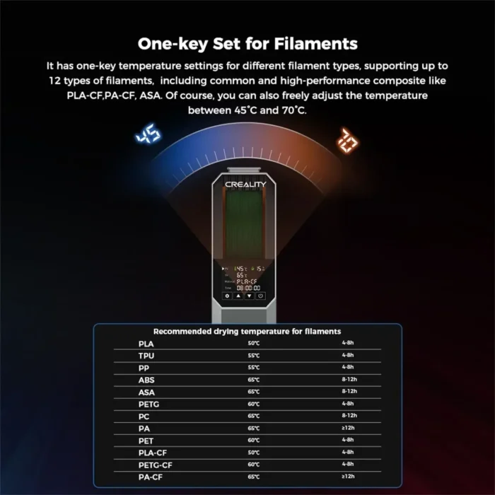 CREALITY Space Pi -filamenttikuivain on suunniteltu parantamaan 3D-tulostuskokemustasi. Tämä laite varmistaa, että filamenttisi pysyy optimaalisessa kunnossa tulostuksen aikana, vähentäen tukoksia ja parantaen tulosteen laatua. Kuivaimen säädettävä lämpötila-alue 45°C – 70°C mahdollistaa erilaisten filamenttityyppien, kuten PLA, ABS, PETG, Nylon ja muita, tehokkaan kuivauksen.