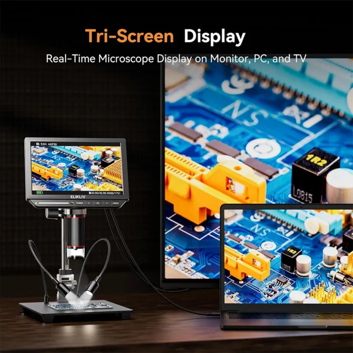 Elikliv EM4K on huippuluokan 4K digitaalimikroskooppi, joka on suunniteltu erityisesti elektroniikan tarkastukseen ja korjaukseen. Tämä mikroskooppi tarjoaa jopa 2000x suurennuksen ja 52 megapikselin HDMI-digitaalikuvan laadun, mikä tekee siitä ihanteellisen työkalun painettujen piirilevyjen (PCB) tarkasteluun ja vianmääritykseen.