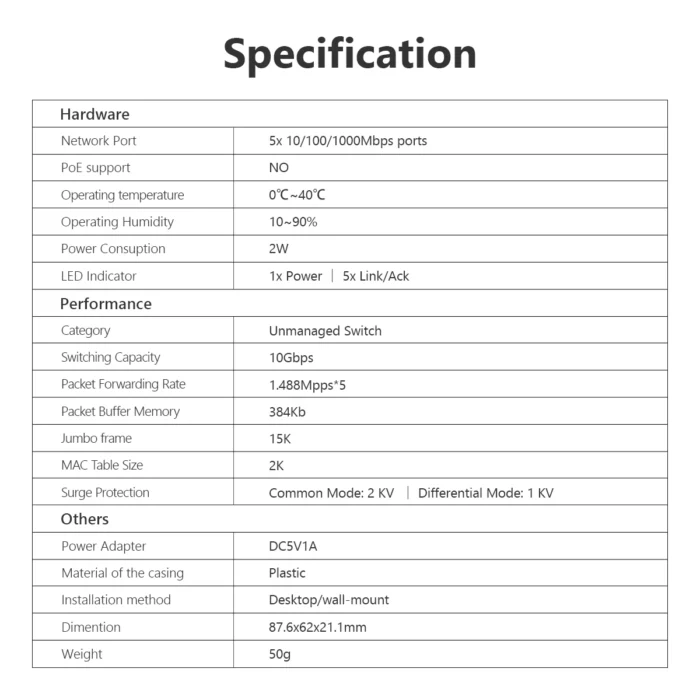 5 tai 8 Gigabitin RJ45-porttia tarjoavat nopeat ja vakaat yhteydet laitteillesi. Auto MDI/MDIX -tuki poistaa ristikytkentäkaapelien tarpeen. Laite tukee IEEE 802.3x -virranhallintaa täydellä duplexilla ja taaksepäinpaineistusta puolitilassa, mikä takaa sujuvan tiedonsiirron. Plug and Play -asennus ei vaadi ohjelmistoja ja tekee käyttöönotosta helppoa. Kompakti muotoilu säästää tilaa ja sopii hyvin erilaisiin käyttöympäristöihin.