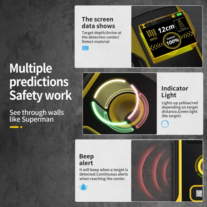 – Monipuolinen seinäskanneri: Laite havaitsee tehokkaasti metallit, puun ja jännitteiset johdot seinärakenteissa, auttaen välttämään vahinkoja poratessa tai naulatessa.