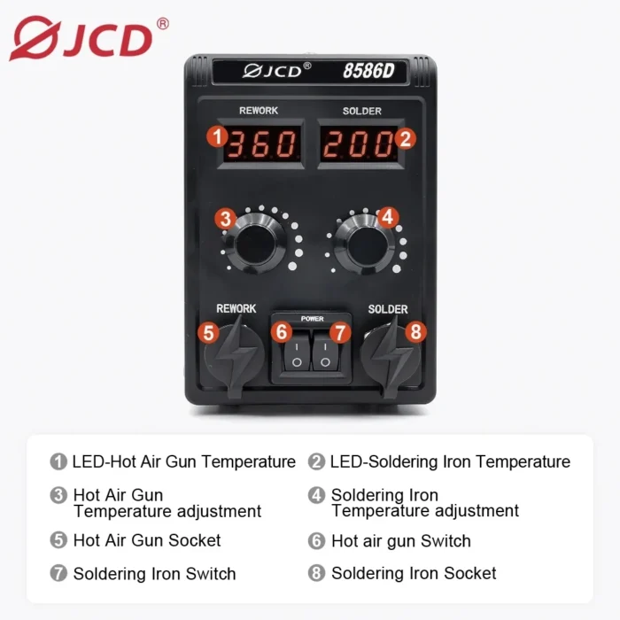 JCD 8586D juotosasema tarjoaa korkealaatuisen ja kustannustehokkaan ratkaisun kaikkiin juotostarpeisiisi, olipa kyseessä sitten harrastusprojektit tai ammattimainen elektroniikan korjaus. Tämä asema ei ainoastaan paranna työn laatua, vaan myös tekee juotostyöstä nopeampaa ja miellyttävämpää.