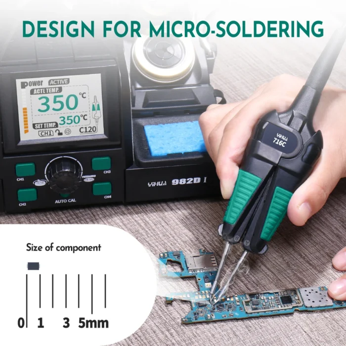 YIHUA 982D-I / III / Pro juotosasema automaattisella kalibroinnilla ja tarkkuuspihdeillä tarjoaa erinomaista suorituskykyä ja tarkkuutta vaativiin juotostöihin. Tämä ammattimainen juotosasema on suunniteltu tarjoamaan luotettavaa suorituskykyä ja tarkkaa lämpötilan säätöä, mikä on ihanteellista vaativille juotosprojekteille. Tarkkuuspihdit mahdollistavat komponenttien tarkan käsittelyn ja juottamisen, mikä tekee työskentelystä nopeampaa ja tehokkaampaa.
