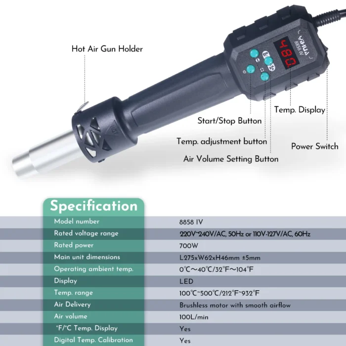 YIHUA 8858-IV digitaalinen kuumailmapuhallin on tehokas 700W työkalu, joka on suunniteltu monipuoliseen käyttöön elektroniikan korjaamisessa ja valmistuksessa. Tämä kuumailmapuhallin tarjoaa tarkan lämpötilansäädön sekä Celsius- että Fahrenheit-asteikoilla, mikä mahdollistaa sen käytön erilaisissa sovelluksissa ja materiaaleilla. Laitteen LCD-näyttö näyttää selkeästi asetetun ja todellisen lämpötilan, mikä helpottaa käyttöä ja parantaa työn tarkkuutta.