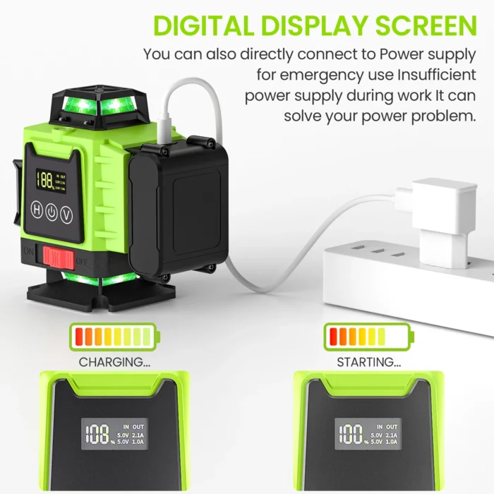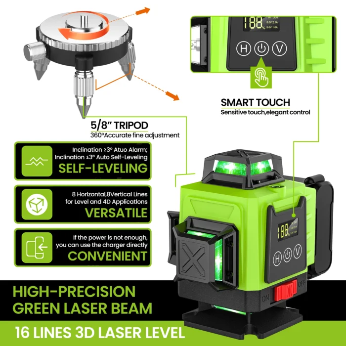 Tutustu ammattimaiseen 4D 16 Lines 3° itsetasaavaan laser-tasoon, joka on suunniteltu tarkkuutta ja tehokkuutta silmällä pitäen. Tämä korkealaatuinen työkalu on varustettu 16 laserlinjalla, jotka tarjoavat 360 asteen kattavuuden sekä vaaka- että pystysuunnassa, mahdollistaen monipuoliset sovellukset rakennustyömailla, sisustusprojekteissa ja muissa tarkkuutta vaativissa tehtävissä.