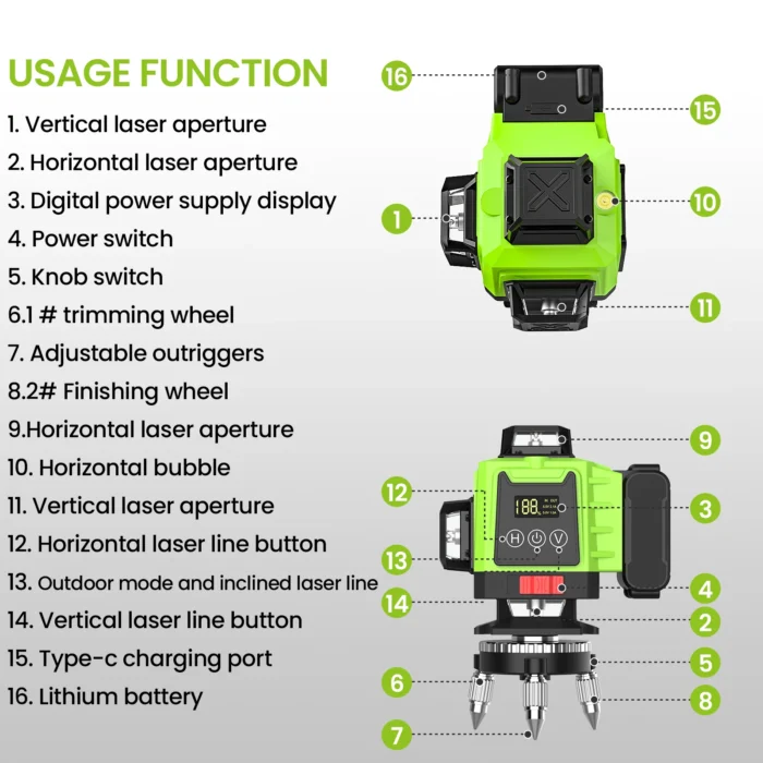 4D 16 Lines laser-taso on ihanteellinen valinta ammattilaisille, jotka vaativat luotettavuutta ja tarkkuutta. Sen monipuolisuus ja helppokäyttöisyys tekevät siitä välttämättömän työkalun, joka säästää aikaa ja vaivaa, ja takaa parhaat mahdolliset tulokset kaikissa projekteissa. Investoimalla tähän työkaluun varmistat, että jokainen yksityiskohta on täydellisesti linjassa, mikä nostaa työn laatua ja tehokkuutta.