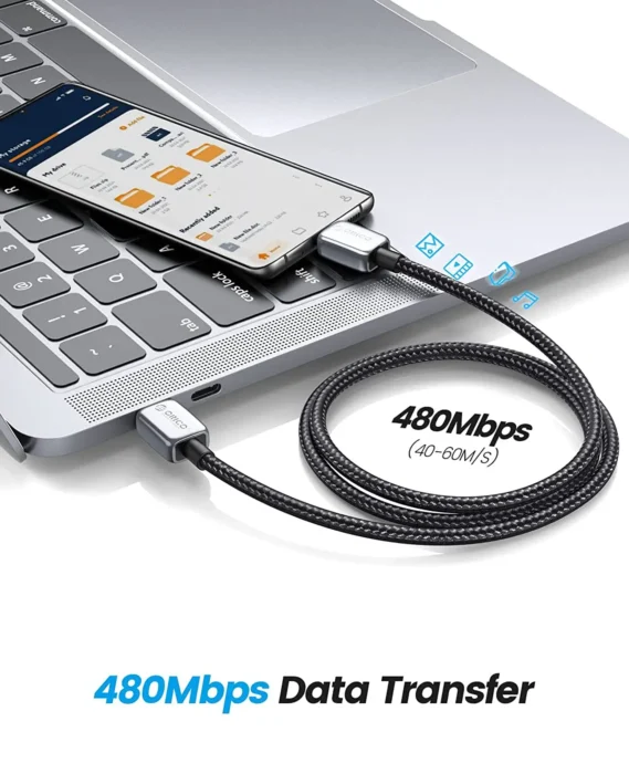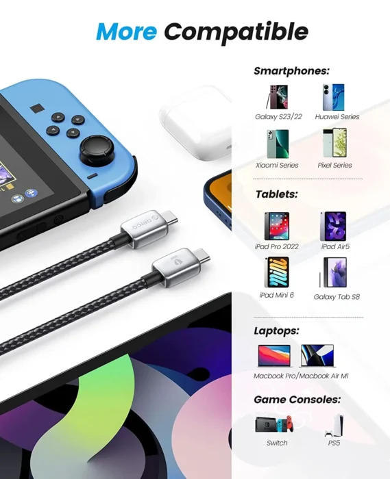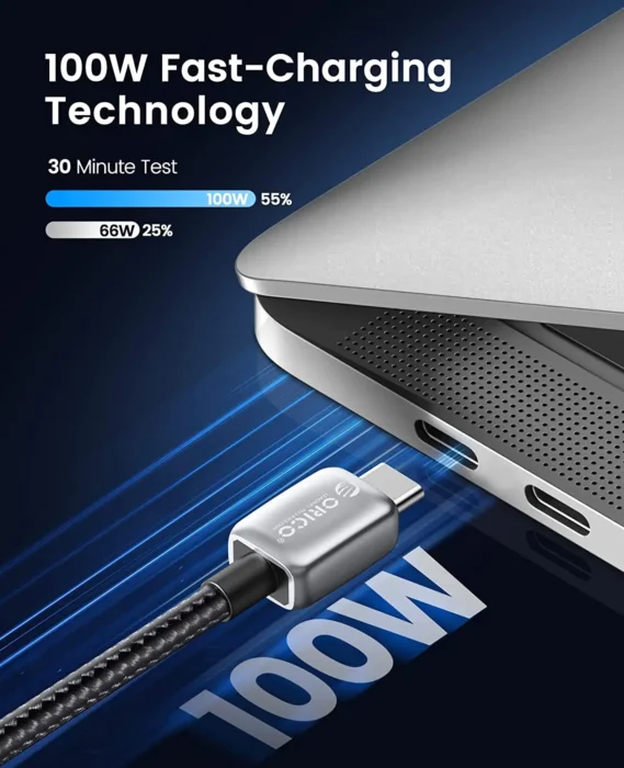 Tutustu ORICO 100W PD USB-C -latauskaapeliin, joka on suunniteltu vastaamaan korkean suorituskyvyn vaatimuksiin. Tämä kaapeli tukee jopa 100 watin tehoa, mahdollistaen nopean ja tehokkaan latauksen laitteillesi, kuten MacBook Pro, iPad Pro, Air, Samsung Galaxy -laitteet, kannettavat tietokoneet ja iPhone 15.
