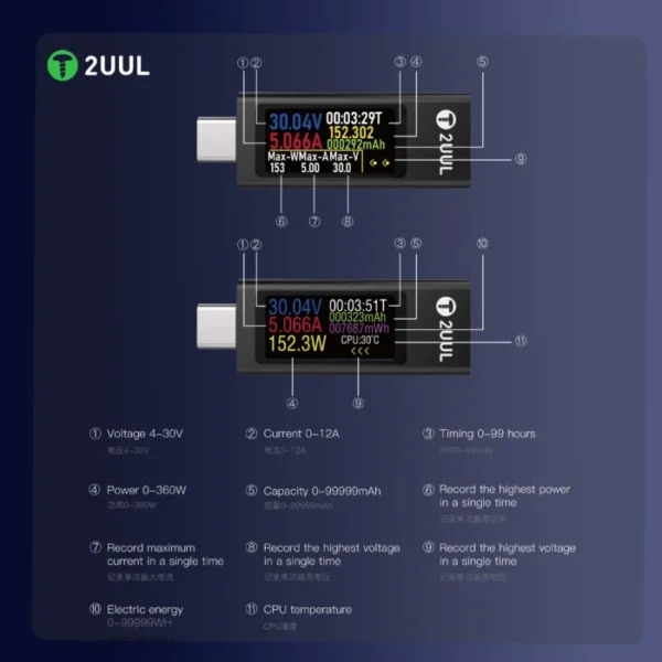 2UUL PW21 Mini Latausmittari on välttämätön työkalu kaikille mobiililaitteiden huoltoammattilaisille ja teknologiaentusiasteille. Tämä pieni, mutta tehokas laite on suunniteltu mittaamaan latausvirtaa kaksisuuntaisesti, mikä mahdollistaa tarkan seurannan sekä sisääntulevan että ulostulevan virran osalta reaaliajassa.