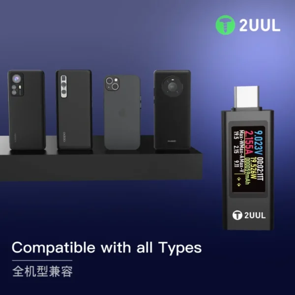 Tuote mahdollistaa nopean diagnostiikan ja korjauksen älypuhelimien, tablettien ja muiden mobiililaitteiden latausongelmiin. 2UUL PW21 on yhteensopiva useimpien markkinoilla olevien mobiililaitteiden kanssa ja tukee sekä tavallista USB-latausta että pikalatausta, tarjoten laajan käyttöalueen eri laitteille.