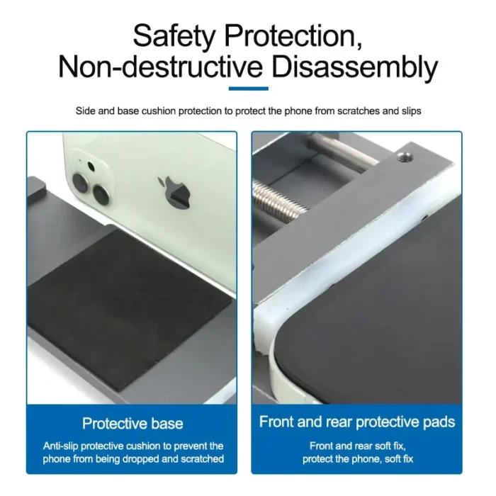 – Säädettävät puristimet: Laitteen puristimet ovat säädettävissä, mikä tekee siitä yhteensopivan useimpien markkinoilla olevien mobiililaitteiden kanssa.