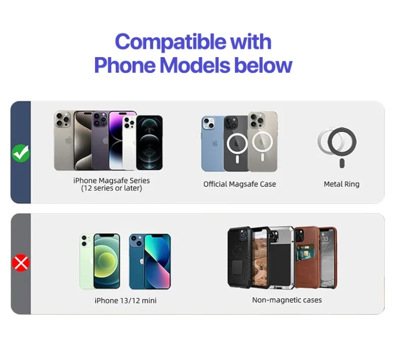 - MagSafe-yhteensopivuus: Magneettinen kiinnitys takaa, että lompakko pysyy turvallisesti kiinni puhelimessasi ilman liukumista tai putoamista. Helppo kiinnittää ja irrottaa, mikä tekee siitä kätevän käyttää päivittäin.