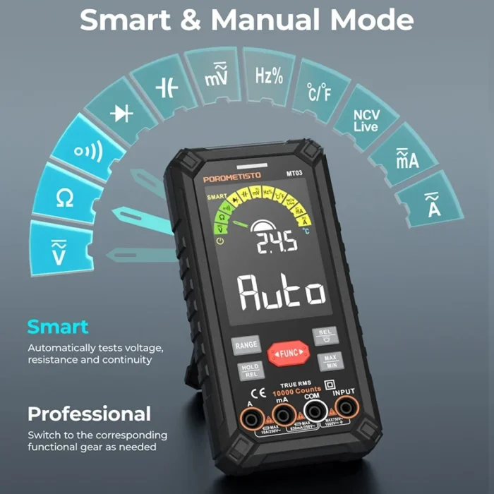 MT03 älykäs digitaalinen yleismittari on korkealaatuinen mittalaite, joka tarjoaa tarkkoja ja luotettavia tuloksia niin ammattilaisille kuin harrastajillekin. Monipuolinen mittari on varustettu todellisella RMS-mittauksella ja korkealla näyttötarkkuudella 9999, mikä mahdollistaa erittäin tarkat mittatulokset.