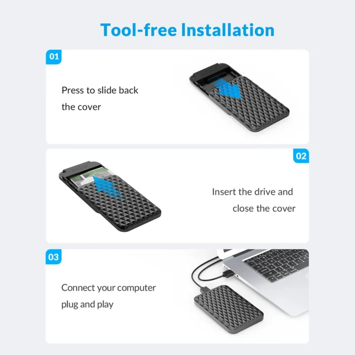 Kotelon yhteensopivuus 7-9.5mm paksuisten 2.5 tuuman SATA-kovalevyjen kanssa tekee siitä monipuolisen valinnan eri käyttäjille. Helppokäyttöinen plug-and-play -asennus ei vaadi ajureita, joten voit aloittaa käytön heti ilman monimutkaisia asennusprosesseja.