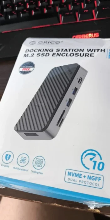 ORICO USB-C -telakointiasema, jossa jäähdytystuuletin ja M.2 NVMe SATA SSD -kotelo