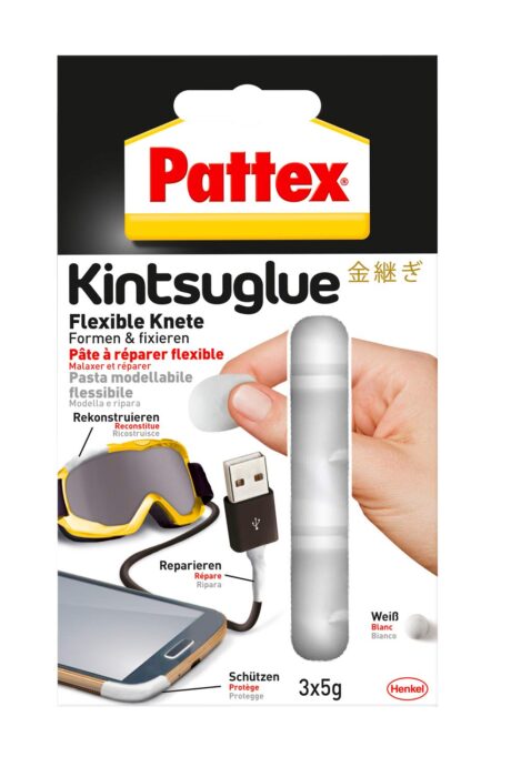 Pakkauksessa on 3 x 5 g Pattex Kintsugluea, irrotettavaa ja muovailtavaa liimapastaa valkoisena. Se ei sovellu PE:lle, PP:lle eikä PTFE:lle. Elä Mottainai-filosofian mukaisesti ja aloita korjaaminen Pattex Kintsugluella.