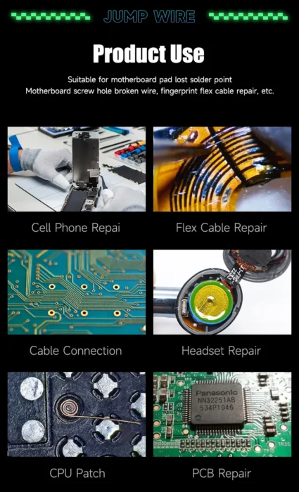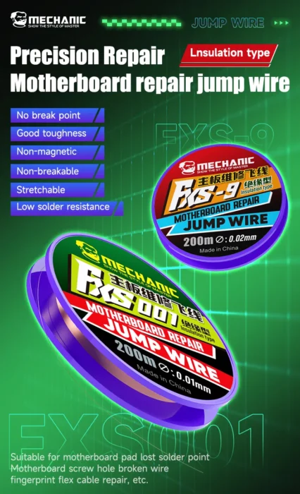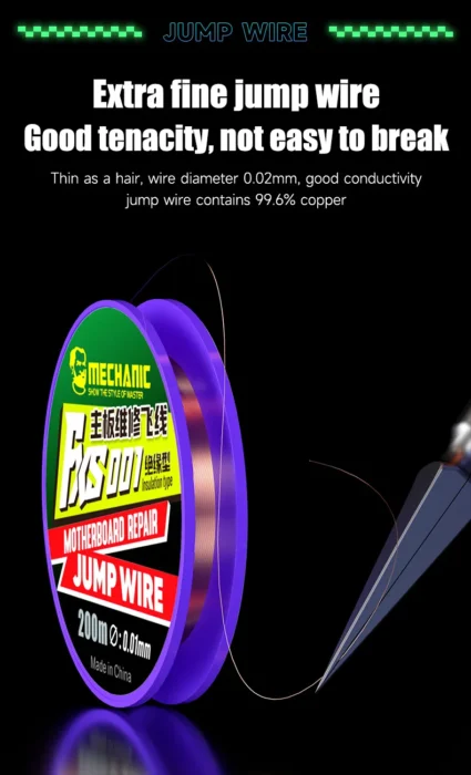 MECHANIC FXS eristetyt kuparihyppylangat tarjoavat elektroniikkakorjausalan ammattilaisille mahdollisuuden suorittaa monimutkaisia ja tarkkuutta vaativia korjauksia luotettavasti ja tehokkaasti. Tuote mahdollistaa laitteiden toiminnallisuuden palauttamisen ja käyttöiän pidentämisen, mikä säästää sekä aikaa että rahaa. Tämä tuote on välttämätön työkalu kaikille, jotka vaativat parasta mahdollista suorituskykyä ja tuloksia korjaustöissään.