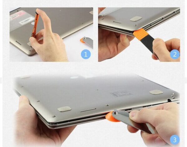 Pyörivä rulla avaustyökalu tablettien ja puhelinten avaamiseen. Pyörivä muovinen rulla helpottaa laitteden avaamista. Liu’uta terää kosketuspaneelin ja rungon välistä varovasti irrottaaksesi sen. Lämpö helpottaa usein liimausten avaamista.