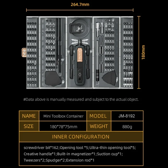 JAKEMY JM-8192 180-in-1 tarkkuusruuvimeisselisarja on suunniteltu vastaamaan kaikkia elektroniikkakorjaustarpeitasi. Tämä monipuolinen työkalusetti sisältää 180 erilaista osaa, mukaan lukien magneettiset kromivanadiiniteräksestä valmistetut kärjet, jotka takaavat pitkän käyttöiän ja kestävyyden. Sarjaan kuuluu erikokoisia ruuvimeisselikärkiä, jotka sopivat useimpiin puhelimien, tietokoneiden, tablettien ja lasien korjaustöihin.