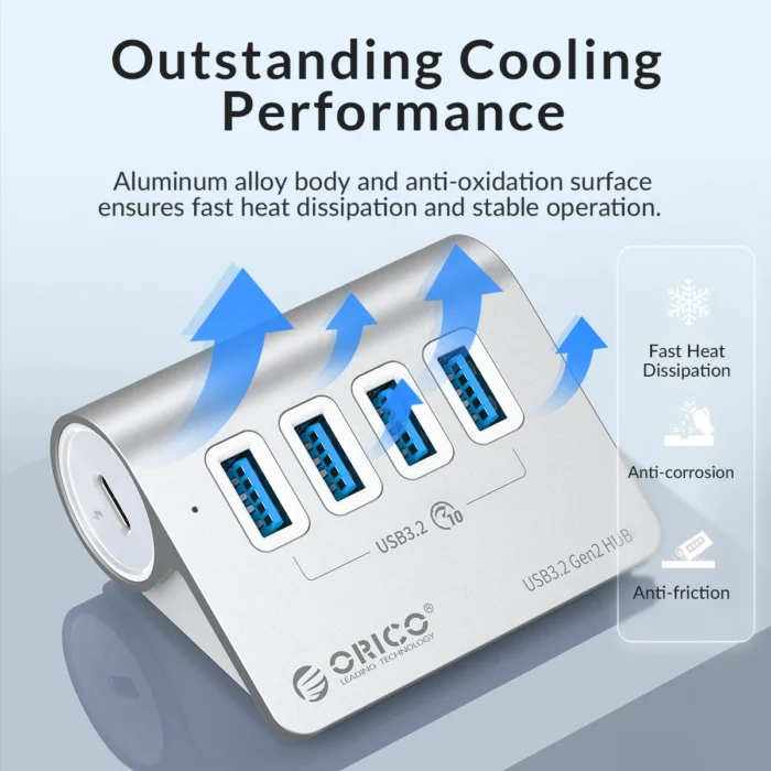 ORICO-hubin alumiinirunko tarjoaa kestävyyttä ja tyylikkyyttä, mutta edistää myös laitteen jäähdytystä aktiivikäytössä. Mukana tuleva korkeatehoinen virtasovitin varmistaa, että kaikki liitetyt laitteet saavat tarvittavan virran suorituskyvystä tinkimättä.
