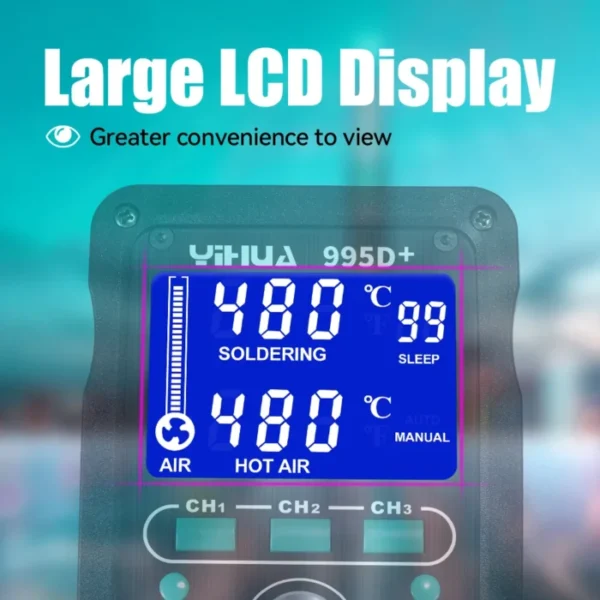 YIHUA 995D+SMD juotosasema kuumailmapuhalluksella on monipuolinen työkalu, joka tekee juottamisesta helppoa ja tehokasta. Asema sisältää irrotettavan kuumailmapistoolin ja juotosraudan BGA-komponenttien juottamiseen, tarjoten ammattilaisille ja harrastajille luotettavan ja tehokkaan työkalun juotostöihin.