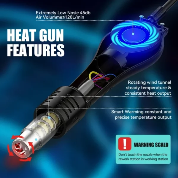 Tämä juotosasema tarjoaa useita käteviä ominaisuuksia, kuten tarkan lämpötilansäädön, nopean lämpenemisajan ja helppokäyttöisen käyttöliittymän. Irrotettavan kuumailmapistoolin ansiosta voit vaihtaa kuumailmapistoolin tarpeen mukaan, mikä tekee työskentelystä entistä joustavampaa.