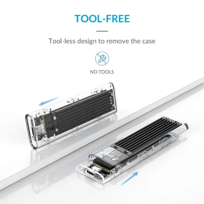 ORICO M2 SSD -kotelo on valmistettu korkealaatuisesta, läpinäkyvästä PC-materiaalista, joka ei ainoastaan suojaa arvokasta SSD:täsi, vaan myös näyttää tyylikkäältä. Läpinäkyvä design mahdollistaa SSD:n tarkkailun reaaliajassa, mikä lisää käyttökokemuksen visuaalista viehätystä.
