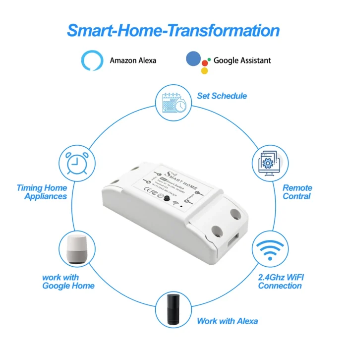 WiFi Zigbee 10A älykytkinmoduuli on älykäs ratkaisu kotiautomaatioon, yhdistäen mukavuuden ja energiatehokkuuden. Tämä langaton kytkinmoduuli mahdollistaa kodin laitteiden ja valaistuksen ohjaamisen mistä tahansa Tuya- tai eWeLink-sovelluksen kautta, sekä äänikomennoilla Amazon Alexan ja Google Homen avulla.